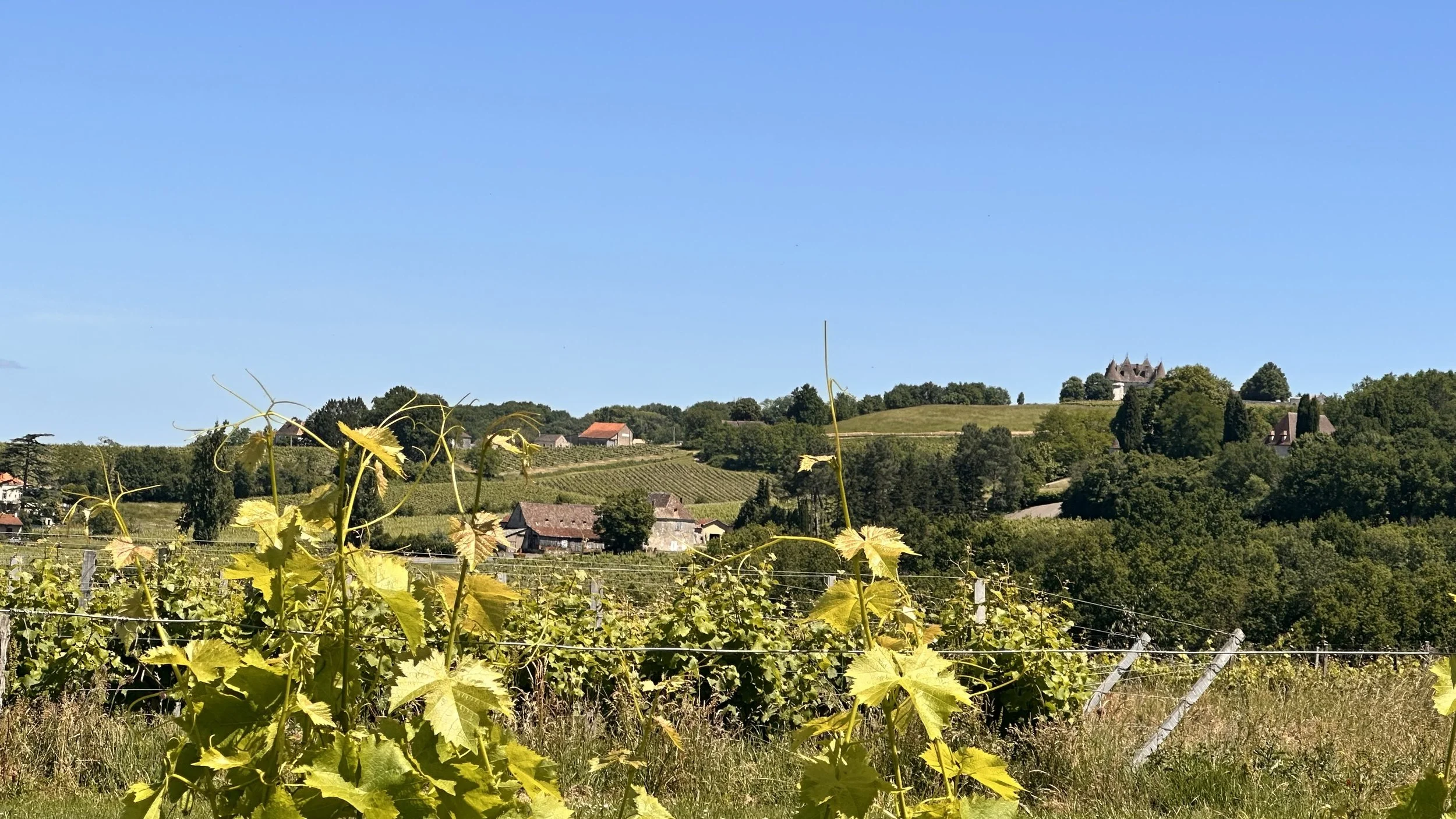 Over the vines and up the hill, you can just see Chateau Monbazillac.