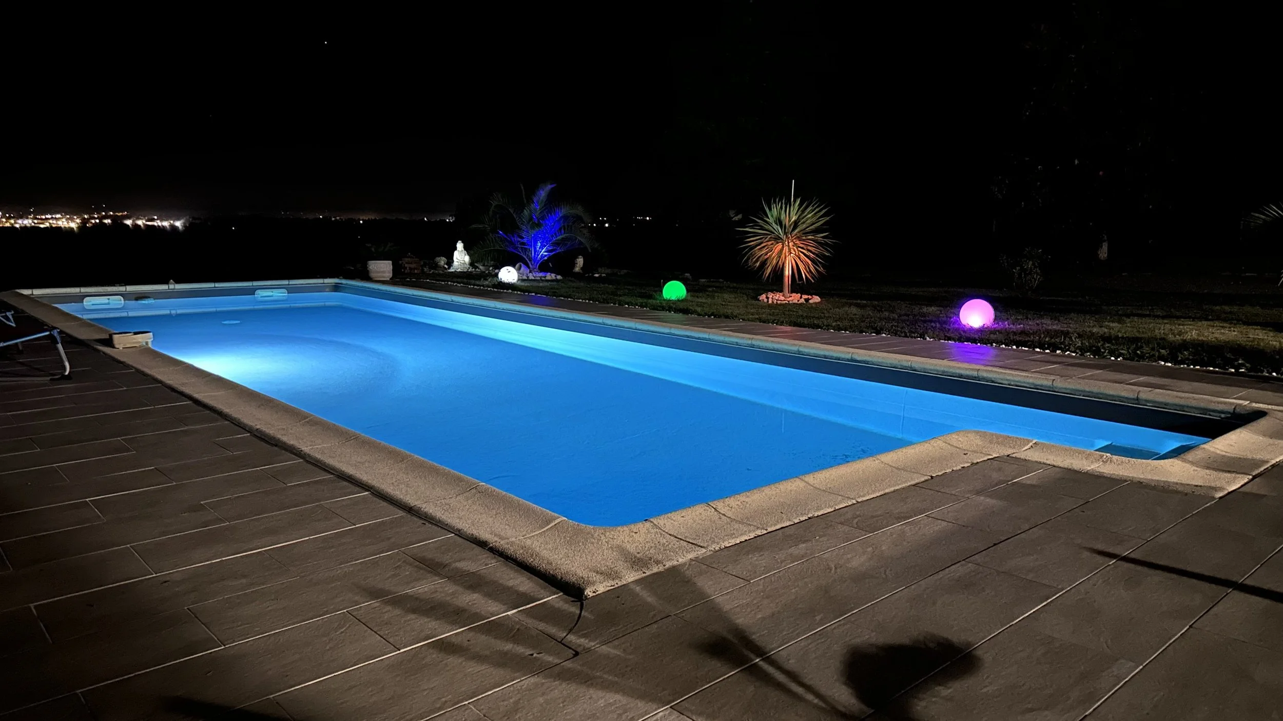 Pool light and solar garden lights create atmosphere at night.