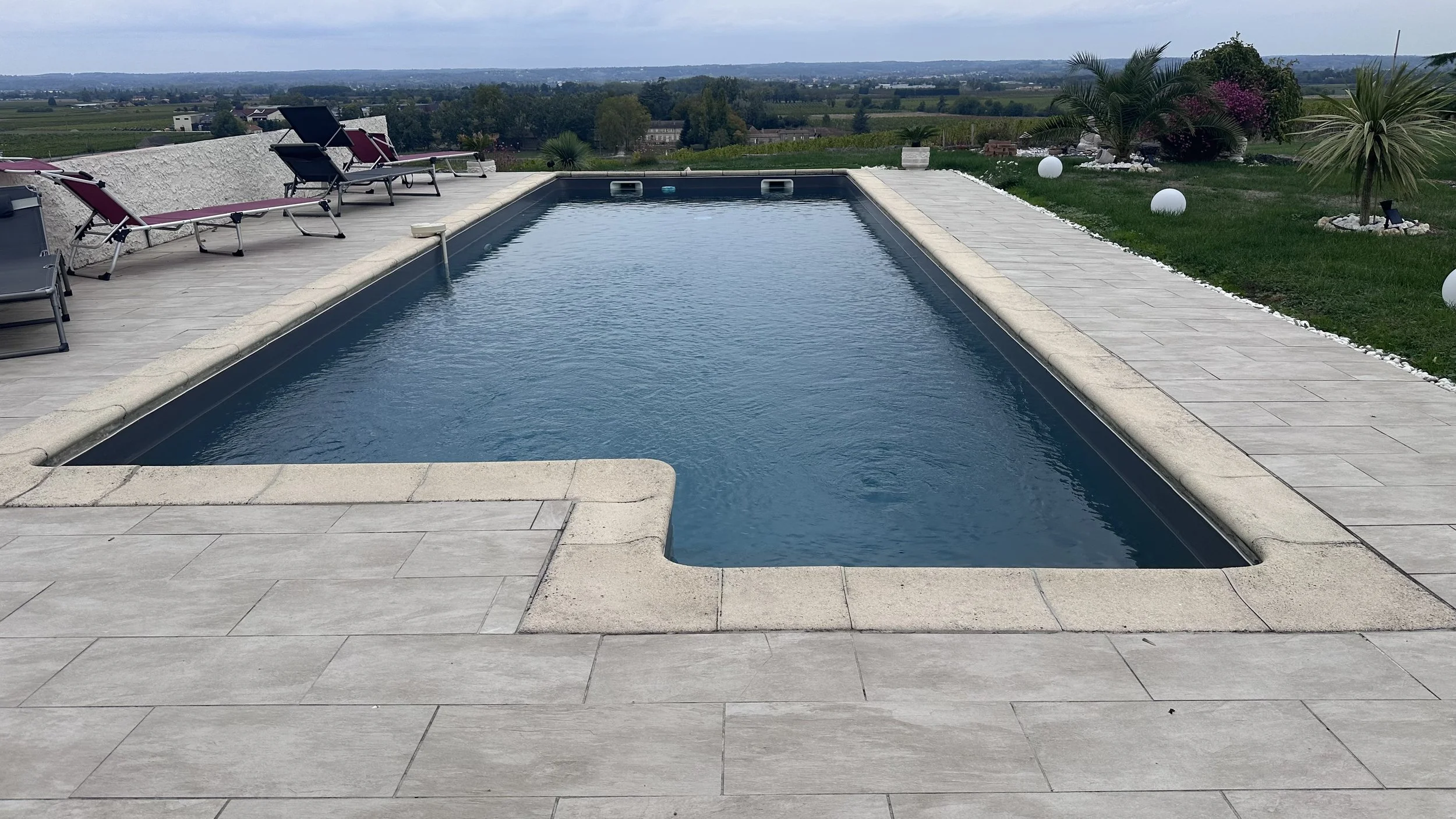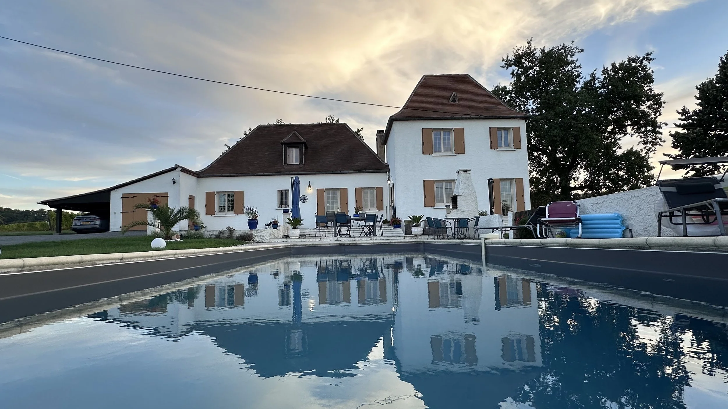 The house from the end of the 12m pool. Several loungers and chairs are available to enjoy the pool area.